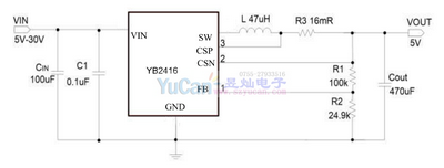 YB2416是支持高電壓輸入的同步降壓電源管理芯片,在4-30V的寬輸入電壓范圍內(nèi)可實現(xiàn)3A的連續(xù)電流輸出。通過調(diào)節(jié)FB端口的分壓電阻,可以輸出1.8V到28V的穩(wěn)定電壓.YB2416具有優(yōu)秀的恒壓/恒流(CC/C)特性.YB2416采用電流模式的環(huán)路控制原理,實現(xiàn)了快速的動態(tài)響應(yīng).YB2416工作開關(guān)頻率為130kHz,具有良好的EMI特性。